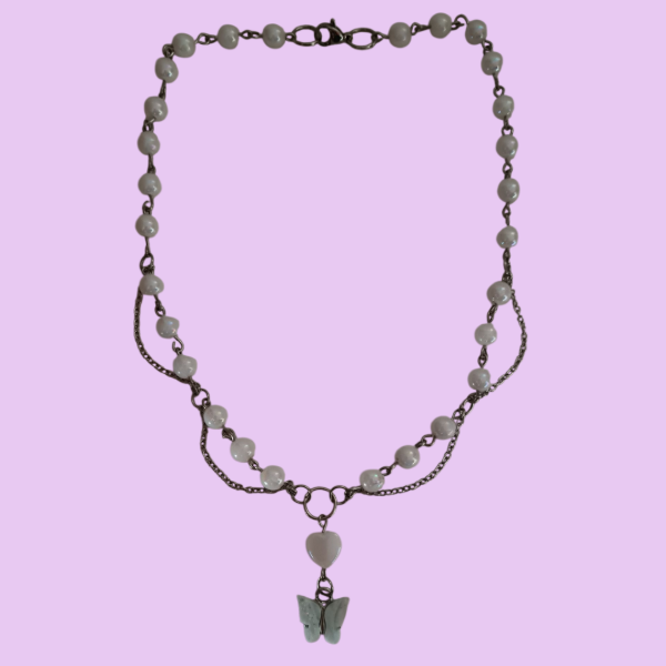 Collar de acero quirúrgico hecho a mano con perlas plásticas tornasol, corazón plástico tornasol, y mariposa de acrílico.